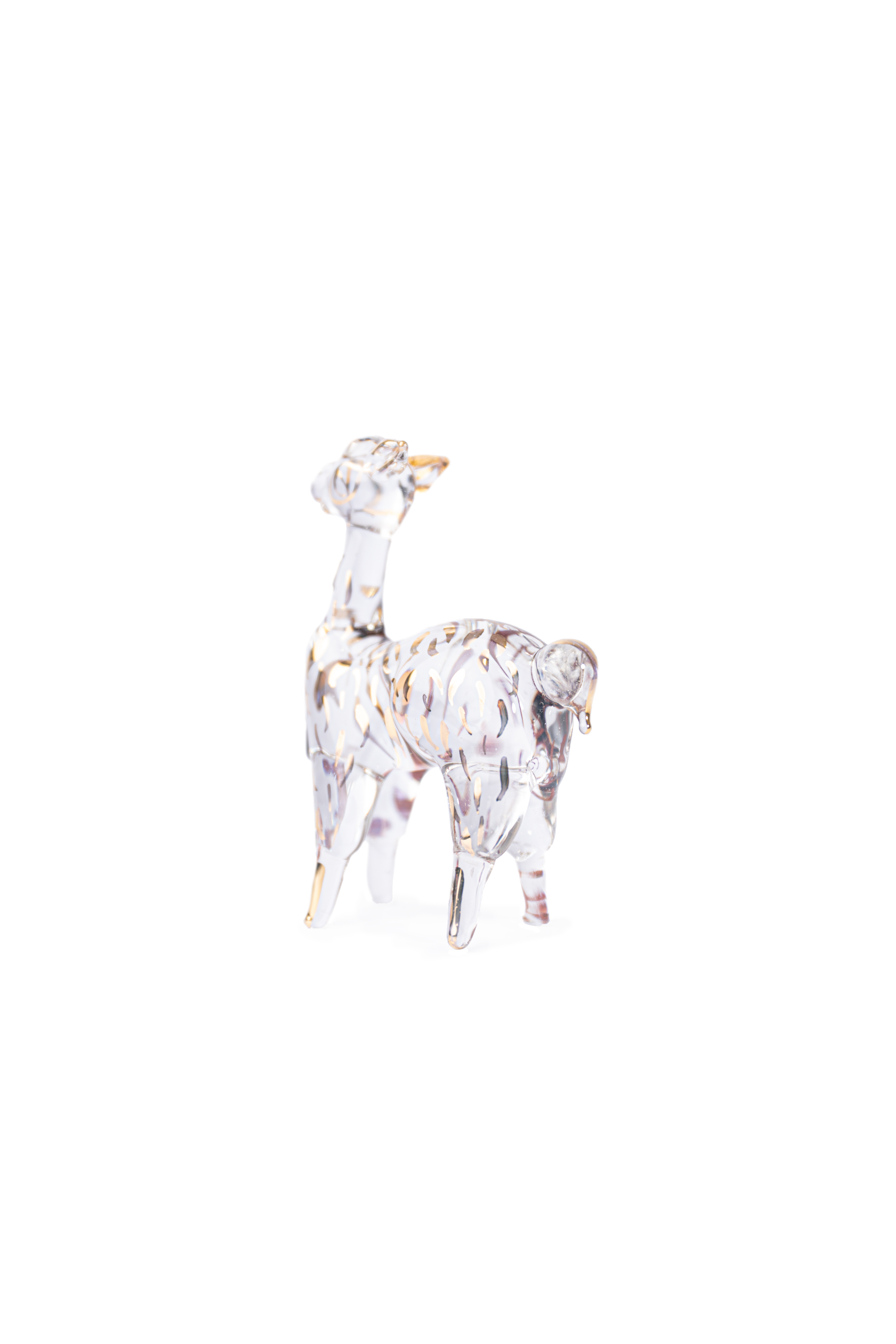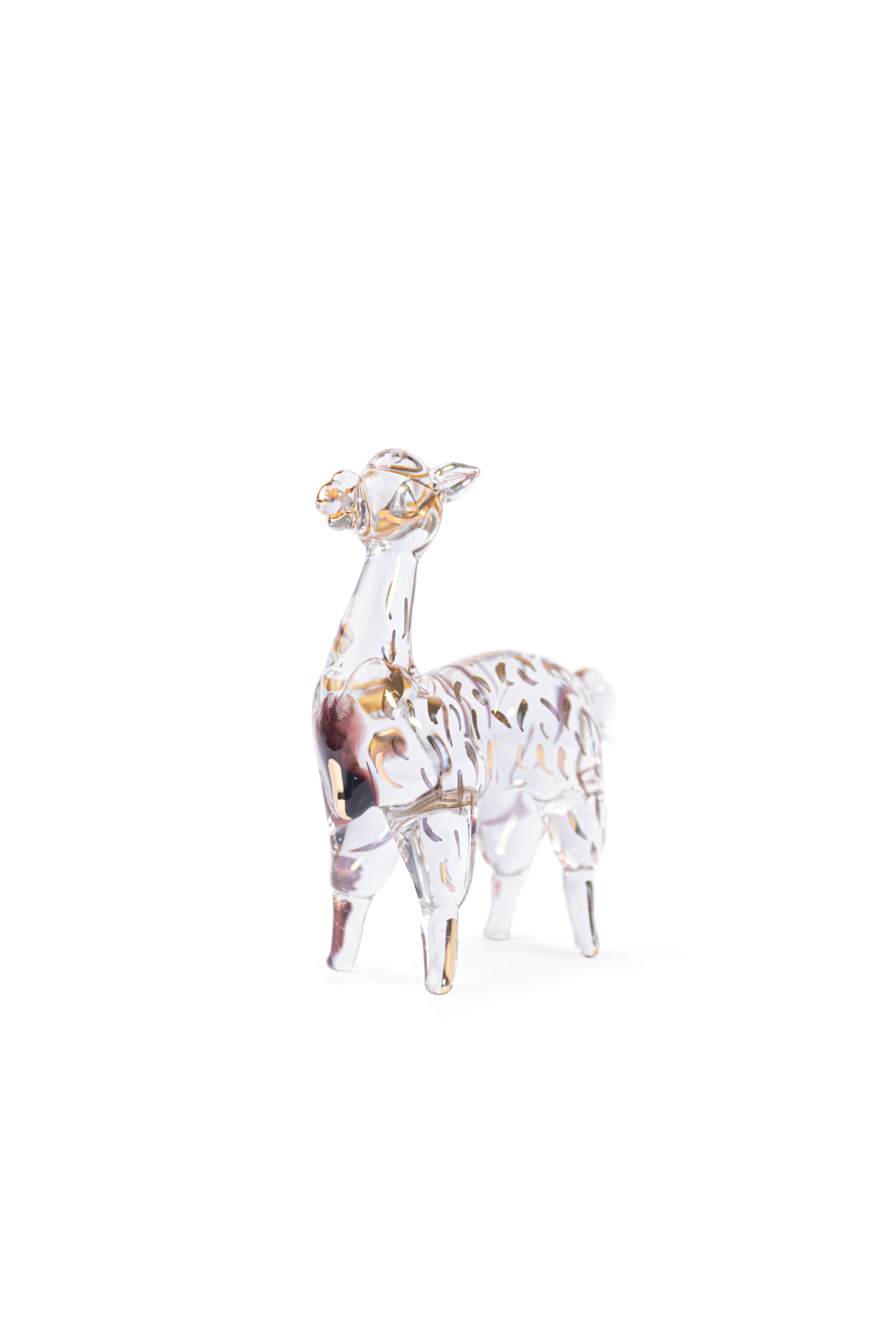 Una pieza que une elegancia y tradición. Esta alpaca de vidrio, delicadamente elaborada, está finamente decorada con grabados en pan de oro, evocando la nobleza y serenidad de los andes en una interpretación contemporánea.