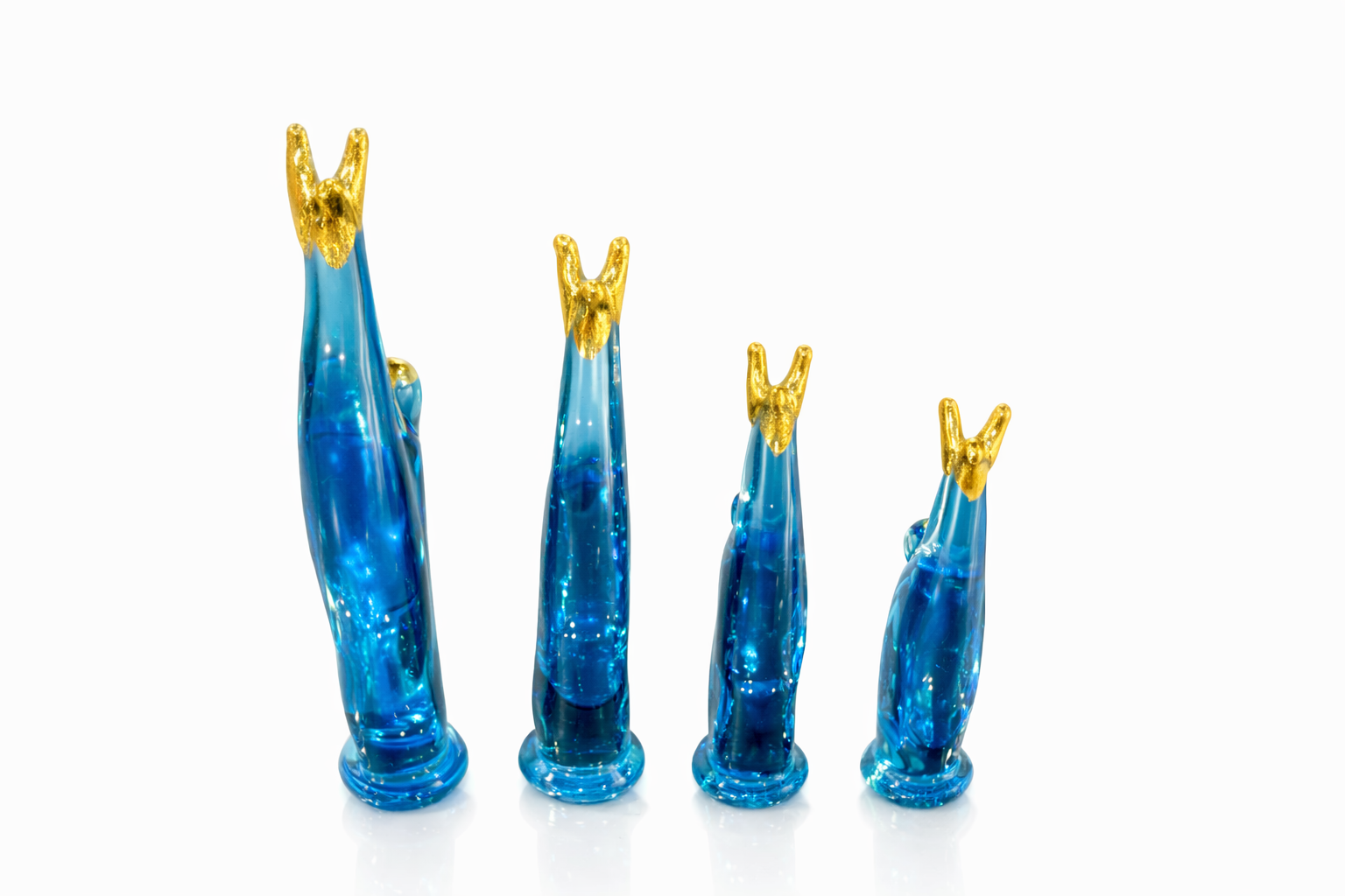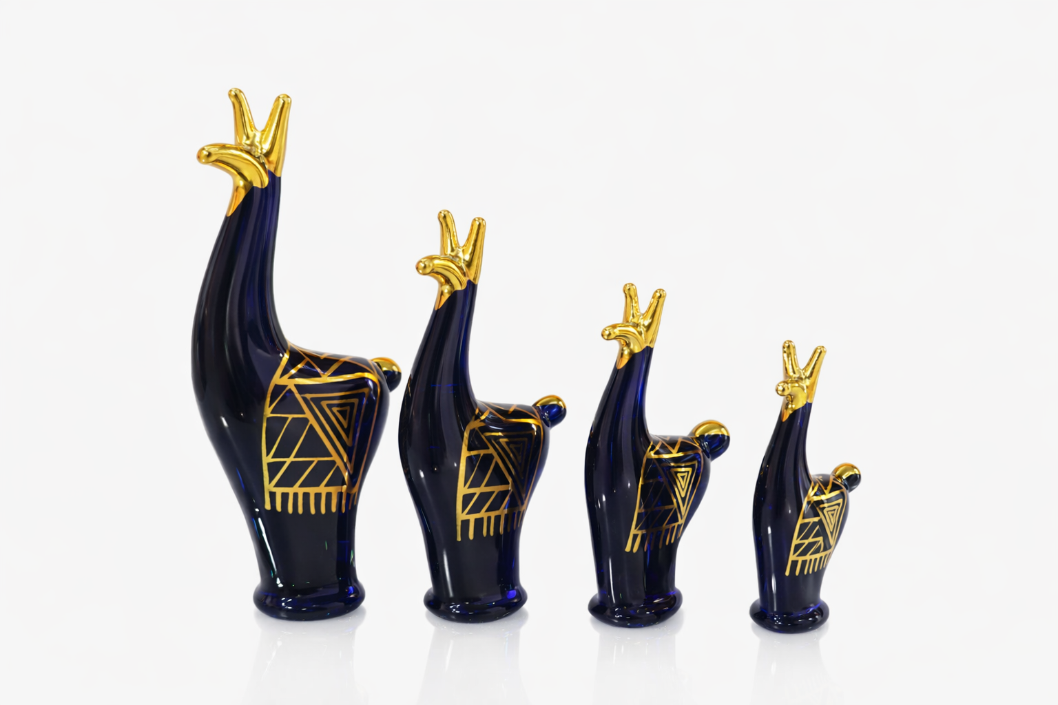 Obra artesanal que encarna la elegancia y la espiritualidad de la llama, ícono de la cordillera andina y símbolo de trabajo, resistencia y conexión con la tierra. Cada figura, modelada a mano en vidrio azul profundo, representa la unión entre lo ancestral y lo contemporáneo. Las líneas ascendentes y las crestas doradas en pan de oro de 14 kilates evocan nobleza, fuerza y renovación.