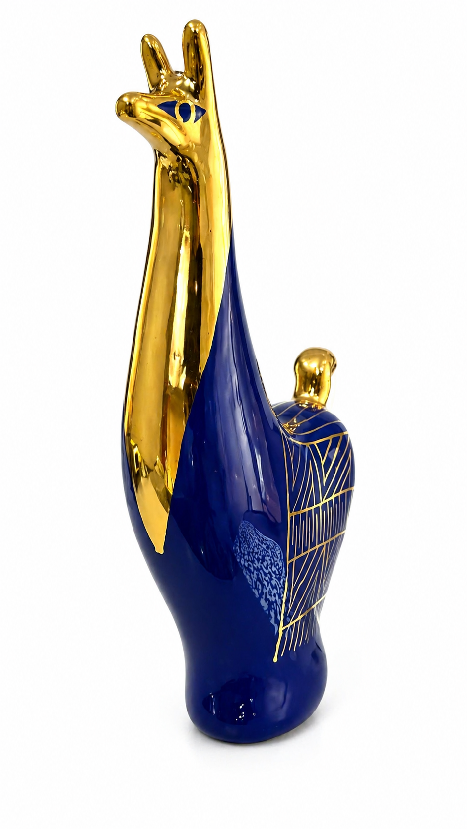 La cabeza, el cuello y la cola están realzados con pan de oro de 14 kilates, aportando un aire de nobleza y prosperidad. El contraste entre la cerámica azul intensa y el dorado brillante transmite equilibrio entre tradición y modernidad, convirtiendo a la pieza en un objeto de colección exclusivo.