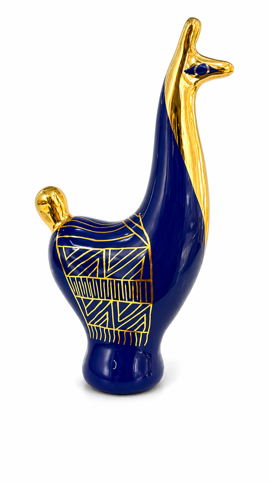 Figura artesanal única que representa la llama andina, símbolo de resistencia, trabajo y conexión con la tierra. Elaborada en cerámica azul profunda, su cuerpo estilizado está decorado con patrones geométricos dorados que evocan los textiles ancestrales del altiplano, reinterpretados en clave contemporánea.