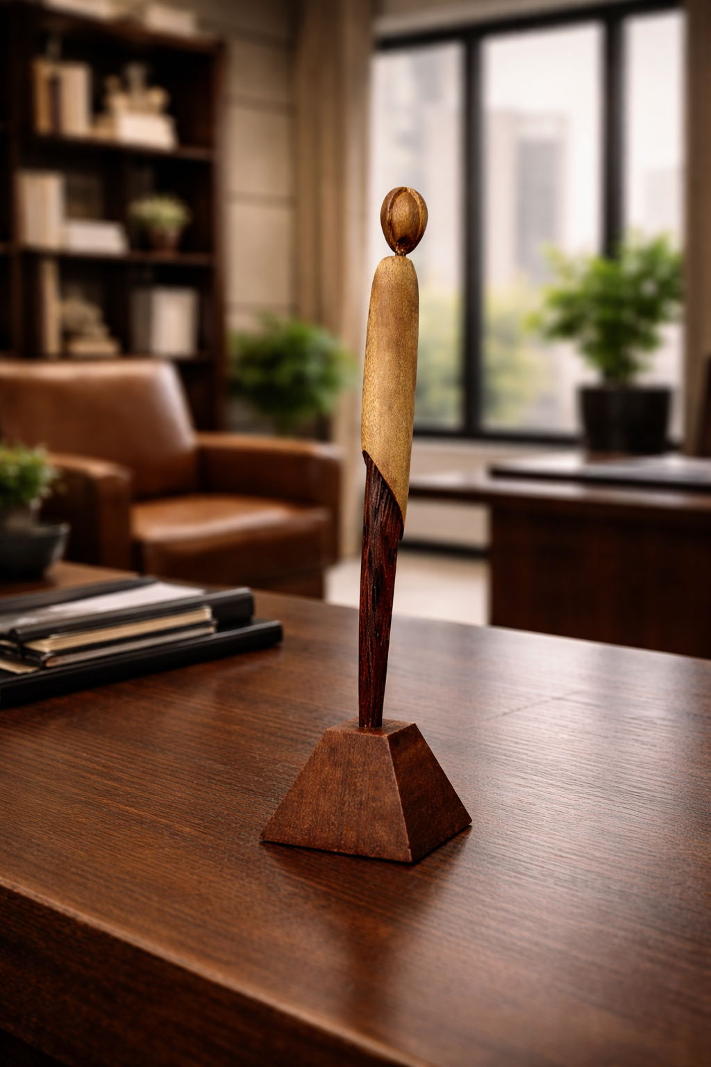 Una escultura que destila elegancia y simplicidad, celebrando la forma femenina a través de la abstracción. Tallada en madera con una combinación armoniosa de tonos claros y oscuros, esta pieza de arte se alza sobre una base sólida, transmitiendo una sensación de serenidad y fuerza sutil. Ideal para espacios que valoran el diseño contemporáneo y la expresión artística pura.